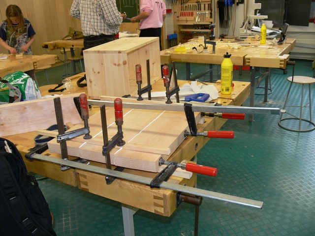 Siinä koko homma puristuksessa. Poikkipuut pitävät laudat samassa tasossa. Voimaa tarvittiin noiden puristimien vääntämiseen. Mutta sitähän löytyy...