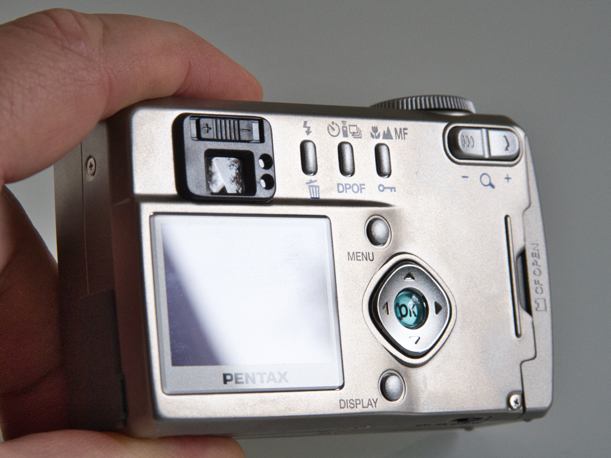 Metallikuorinen digikompakti vuosituhannen alkupuolelta.